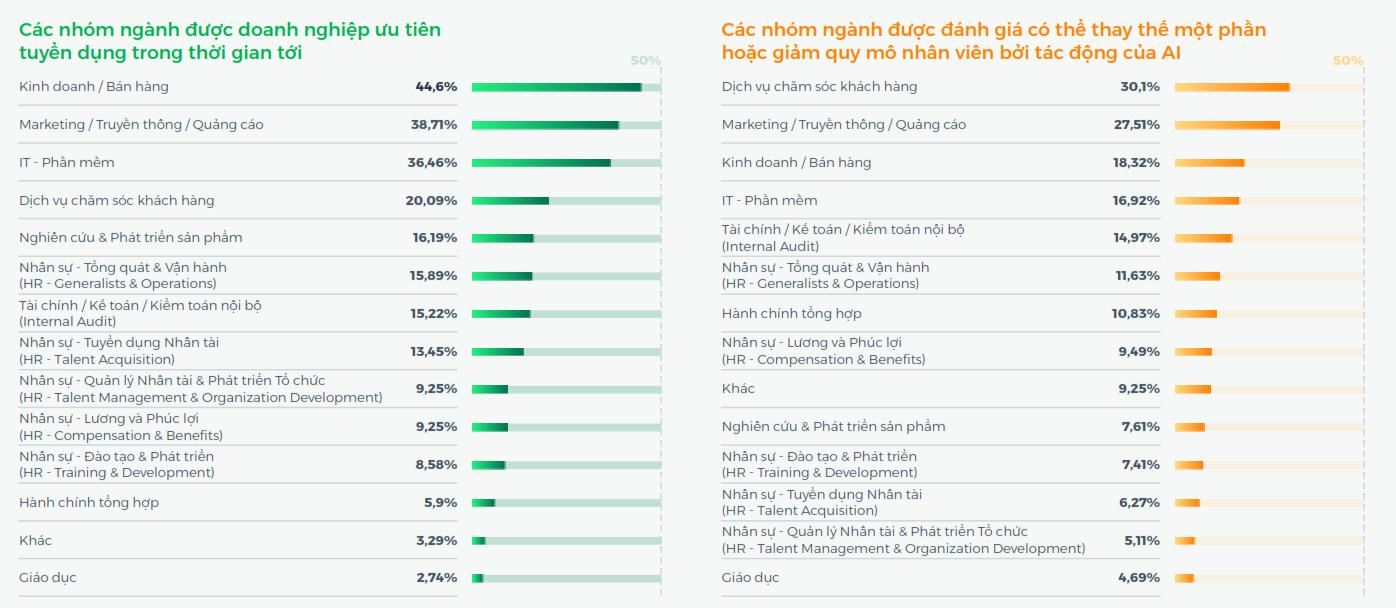 - IT - Phần mềm, đặc biệt các vị trí liên quan đến AI, dữ liệu, phát triển sản phẩm số, tiếp tục là nhóm được ưu tiên.